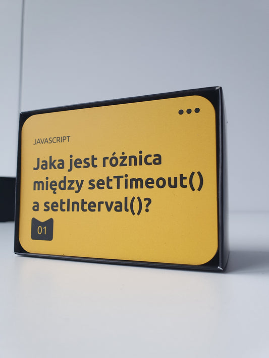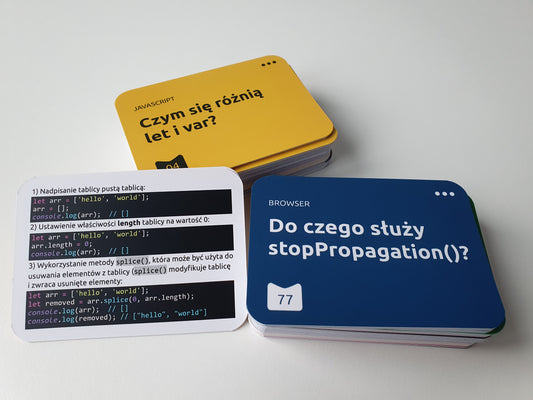 ReactJS + JavaScript. Fiszki są bardzo przydatne przy przygotowaniu do rozmów kwalifikacyjnych (dla obu stron :) ) jak i po prostu przy poszerzaniu swojej wiedzy. Bardzo podoba mi się wykonanie fiszek, które są wysokiej jakości. Polecam!