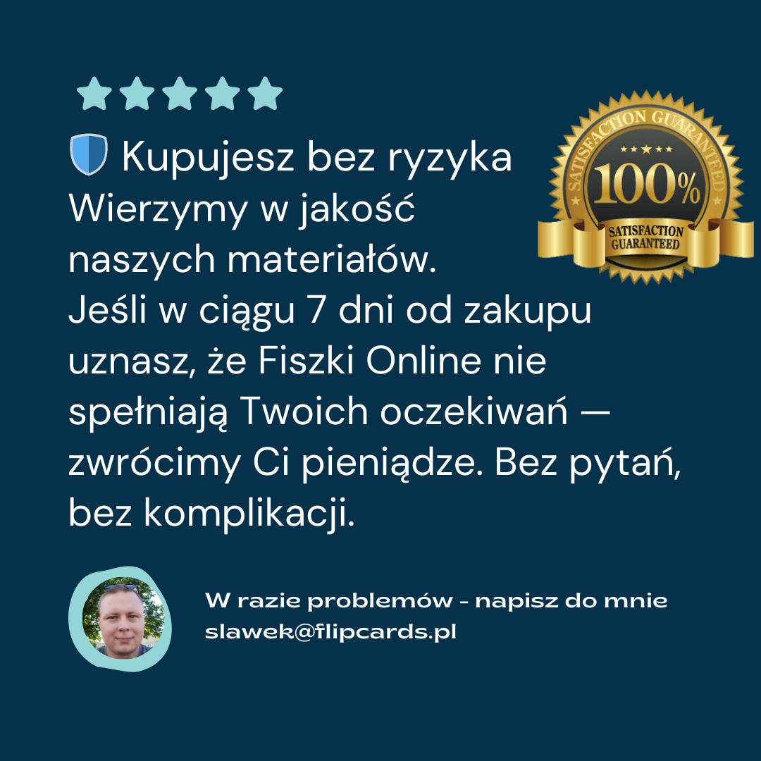 Dajemy Ci tydzień na przetestowanie Fiszek Online. Jeśli uznasz, że to nie dla Ciebie — oddamy Ci 100% wpłaconej kwoty. Żadnych ukrytych warunków.