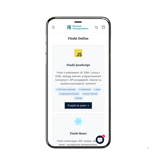 ReactJS + JavaScript. Fiszki są bardzo przydatne przy przygotowaniu do rozmów kwalifikacyjnych (dla obu stron :) ) jak i po prostu przy poszerzaniu swojej wiedzy. Bardzo podoba mi się wykonanie fiszek, które są wysokiej jakości. Polecam!
